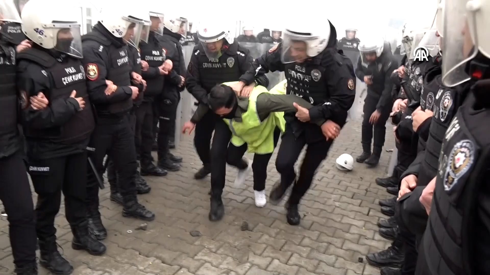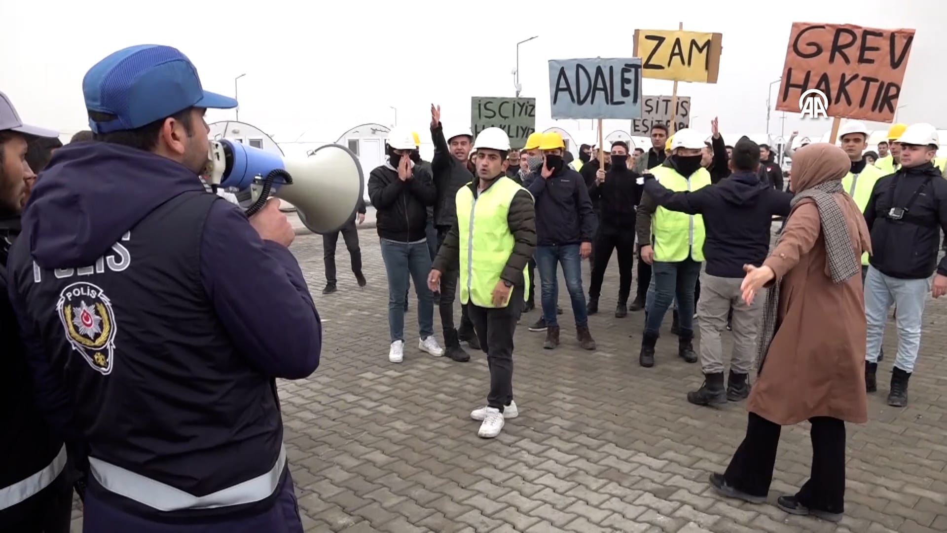 Kasket takarak grev hakları için eylem yapan emekçilere, zaman zaman müdahale edildi; bazıları gözaltına alındı.